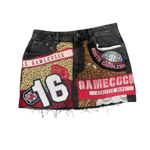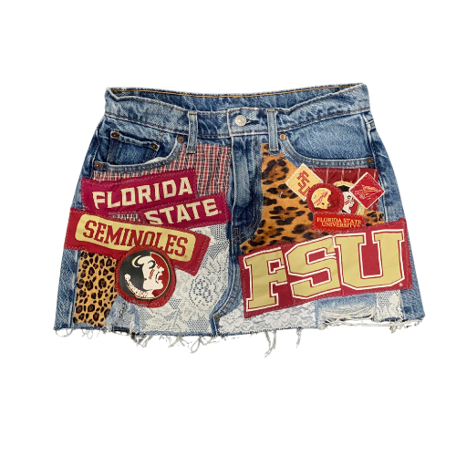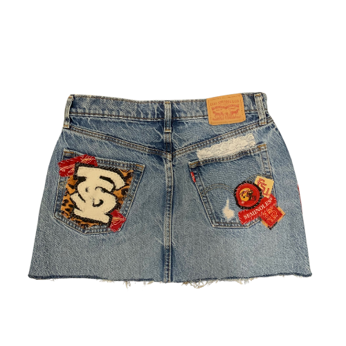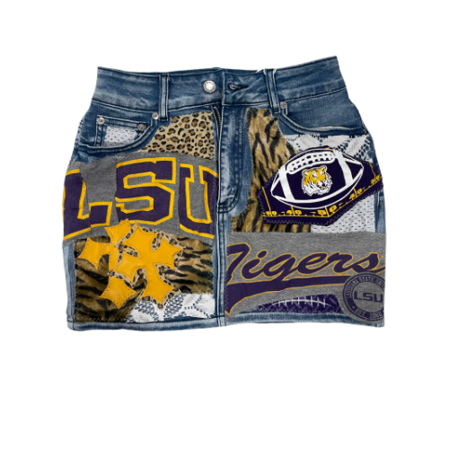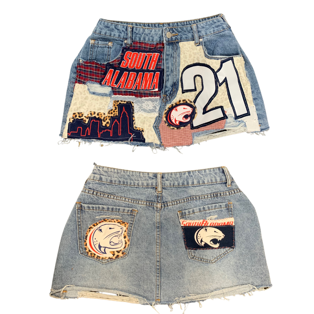 -Custom-made patchwork denim skirt with the school of choice on it. It will also include other forms of print and fabrics that match the school spirit! Unless a specific vision is desired and discussed, the design will be freestyled.