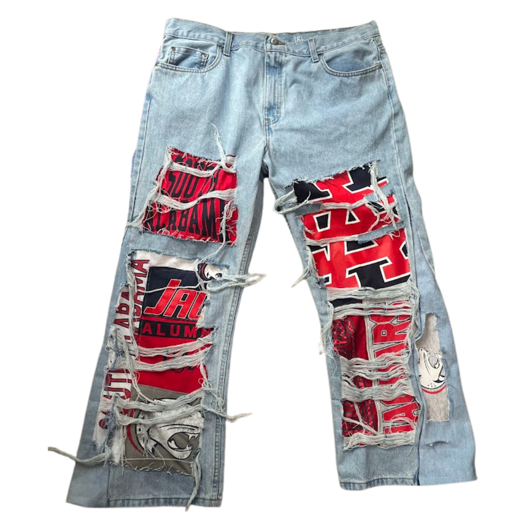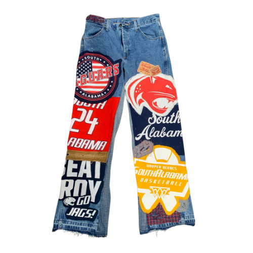 -Custom-made patchwork denim jeans with the school of choice on it. It will also include other forms of print and fabrics that match the school spirit! Unless a specific vision is desired and discussed, the design will be freestyled.